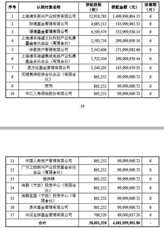 从获配名单看,上海浦东新兴产业投资有限公司获配金额最多,达15亿元;财通基金获配金额位居第二,为5.44亿元;诺德基金获配5.33亿元。