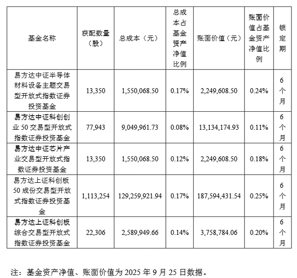 目前,易方达基金已发布旗下部分基金获配盛美上海非公开发行A股的公告。公告显示,易方达旗下有5只产品获配,均为半导体芯片主题和科创板相关宽基ETF,包括李树建管理的易方达中证半导体材料设备主题ETF、成曦和伍臣东管理的易方达中证科创创业50ETF、张湛管理的易方达中证芯片产业ETF等。