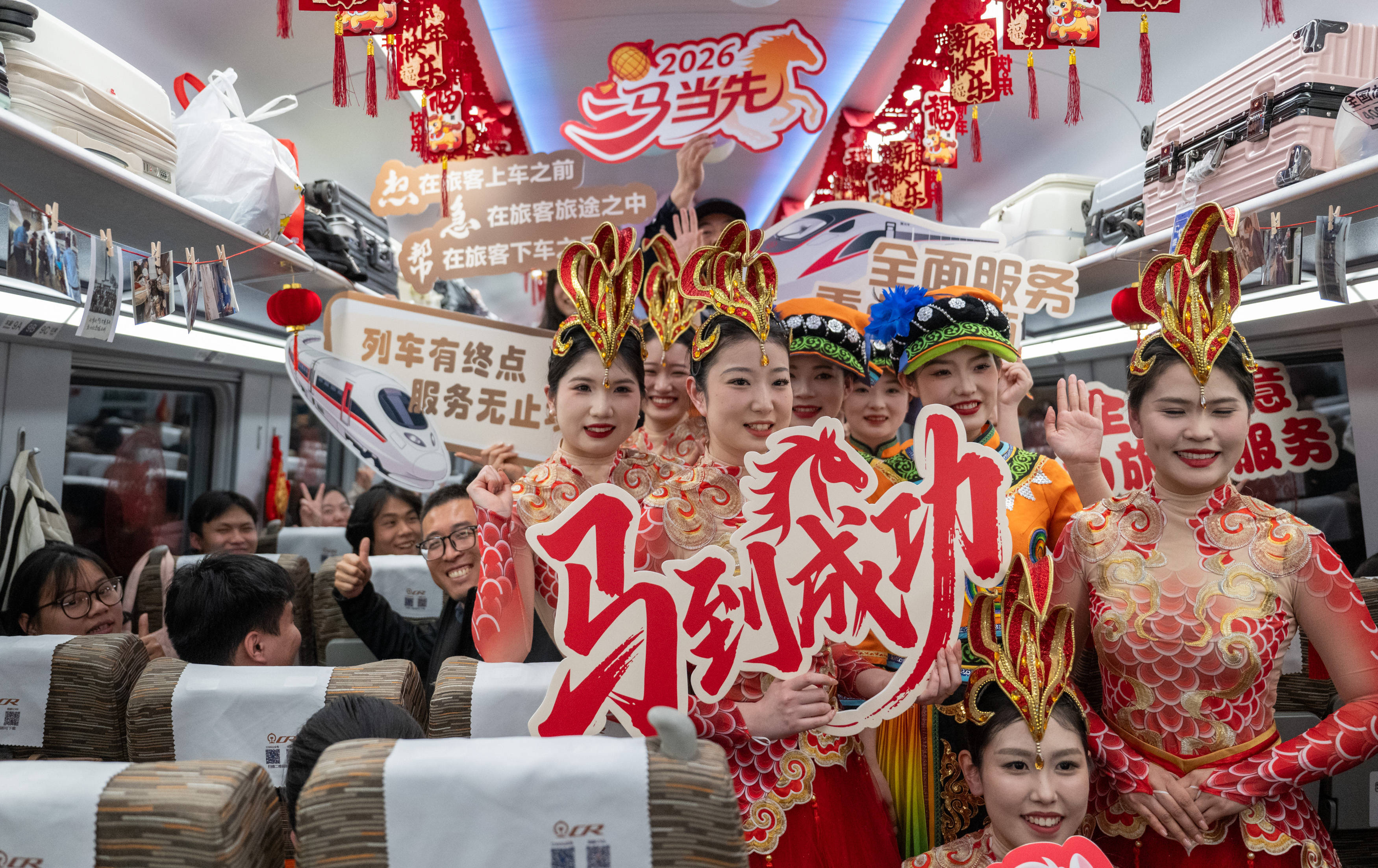 “快看!乘务员上场表演啦!”2月10日晚8时许,搭载869名乘客的D38次列车从汉口站驶出不久,音乐声便吸引了8号车厢内乘客的关注,一场特别的“列车春晚”在此拉开帷幕。