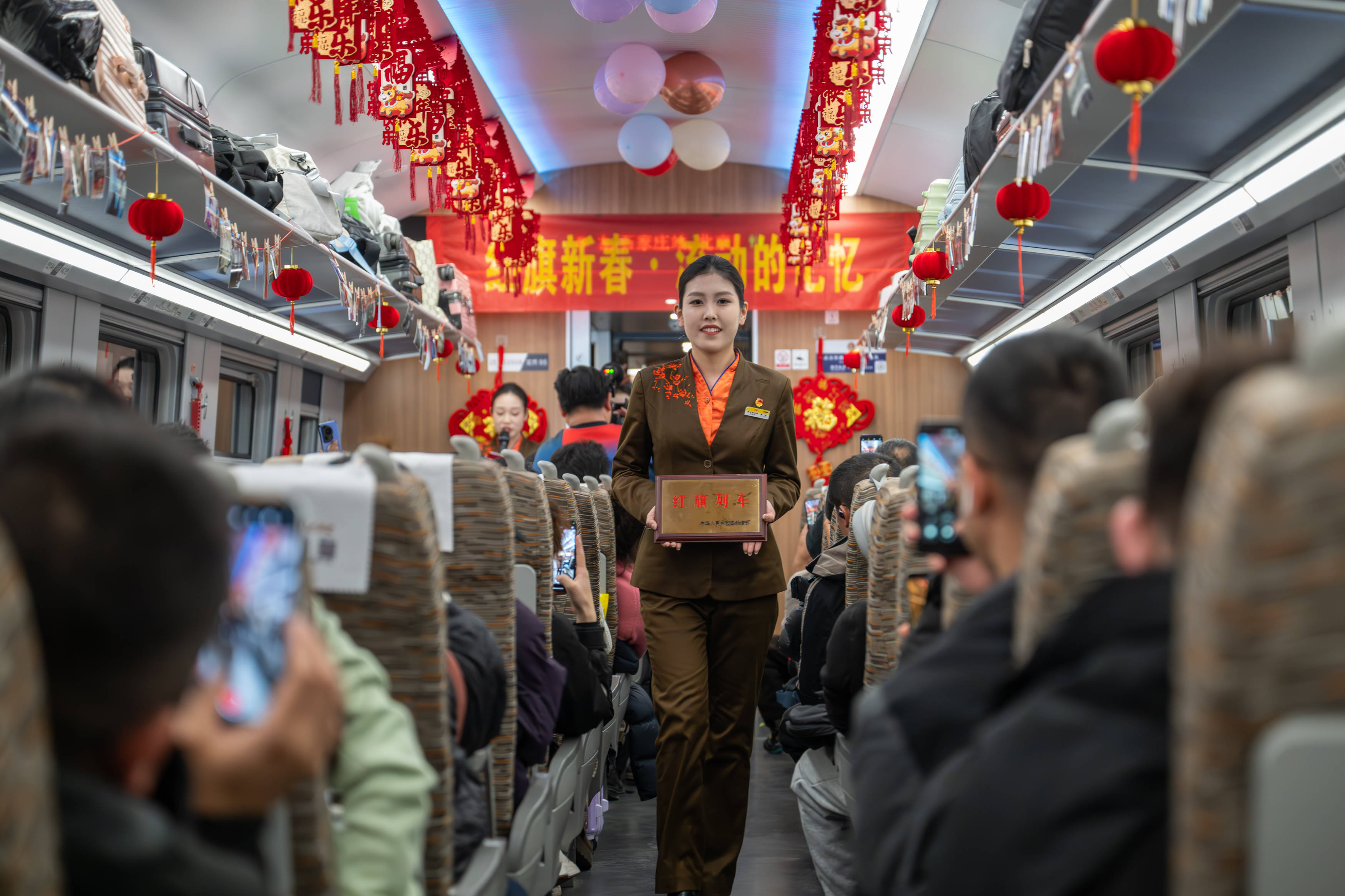 2月10日晚,D38次乘务组在列车上举办新年联欢会。新华社记者杜子璇 摄这些节目是中国铁路武汉局集团有限公司武汉客运段13名乘务员利用休息时间自发编排的,既富有荆楚特色,也透着红色气质。“大家都乐意参加,想通过这种方式,传承‘红旗列车’的服务初心。”参与表演的乘务员王龑说。
